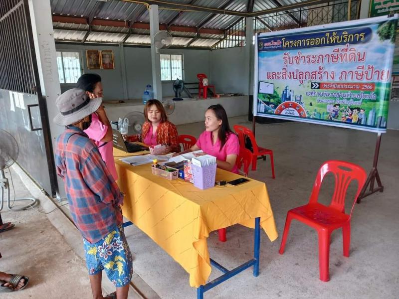 นางสาวนิภาพร ยิ่งยง เจ้าพนักงานจัดเก็บรายได้ชำนาญงาน และเจ้าหน้าที่ ออกพื้นที่ให้บริการรับชำระภาษีที่ดินและสิ่งปลูกสร้าง ภาษี ป้าย ประจำปี 2566 ในเขตพื้นที่ตำบลโพนโก
