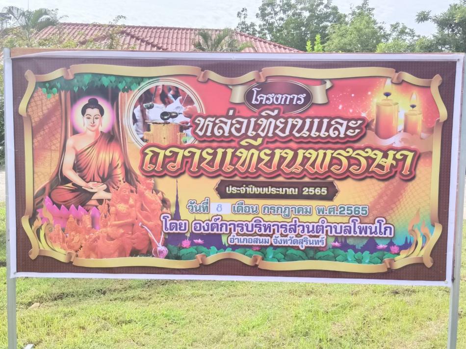 วันศุกร์ ที่ 8 เดือน กรกฏาคม พ.ศ. 2565 เวลา 09.30 น. นายสุรินทร์ ตรองจิตต์ นายกองค์การบริหารส่วนตำบลโพนโก คณะผู้บริหาร เจ้าหน้าที่ พนักงานจ้างและผู้นำชุมชน ได้จัดทำโครงการหล่อเทียนและถวายเทียนพรรษา ประจำปีงบประมาณ 2565 [8 กรกฎาคม 2565]