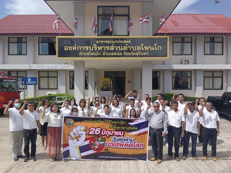 นายสุรินทร์ ตรองจิตต์ นายกองค์การบริหารส่วนตำบลโพนโก คณะผู้บริหาร เจ้าหน้าที่ และพนักงานร่วมกิจกรรม 26 มิถุนายน วันต่อต้านยาเสพติดโลก ณ ลานหน้าอาคารอเนกประสงค์ องค์การบริหารส่วนตำบลโพนโก [26 มิถุนายน 2566]