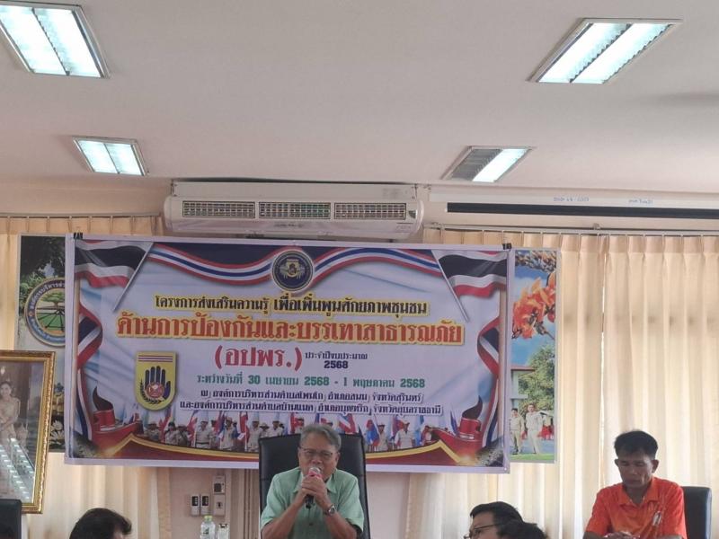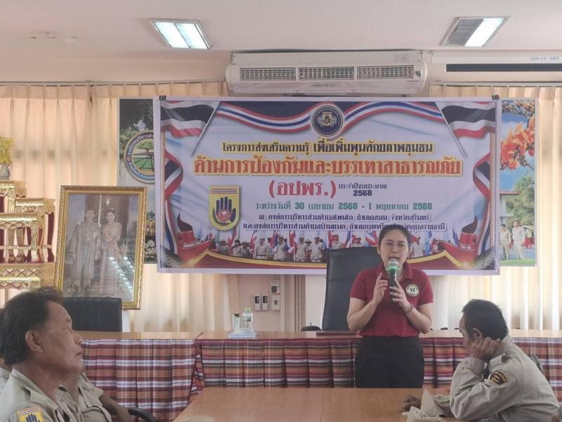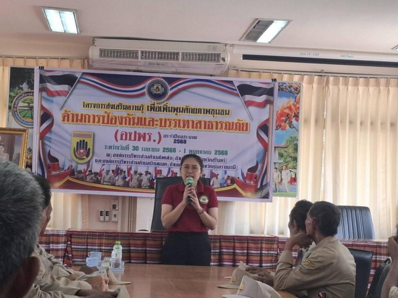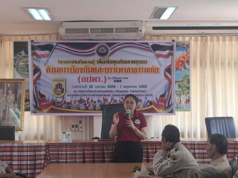 วันที่ 30 เมษายน - 1 พฤษภาคม 2568 โครงการส่งเสริมความรู้เพื่อเพิ่มพูนศักยภาพชุมชนด้านการป้องกันและบรรเทาสาธารณภัย (อปพร.) ประจำปีงบประมาณ พ.ศ. 2568เพื่อพัฒนาความรู้ความสามารถให้กับประชาชน และสมาชิกอาสาสมัครป้องกันภัยฝ่ายพลเรือน (อปพร)ได้รู้เท่าทันต่อการเปลี่ยนแปลงที่เกิดขึ้นสามารถร่วมกันป้องกันและบรรเทาสาธารณภัยที่อาจเกิดขึ้นต่อชีวิตและทรัพย์สินของประชาชนได้อย่างทันท่วงที และเกิดประสิทธิภาพตามวัตถุประสงค์ที่ได้กำหนดไว้ (ภาพกิจกรรมชุดที่ 1)