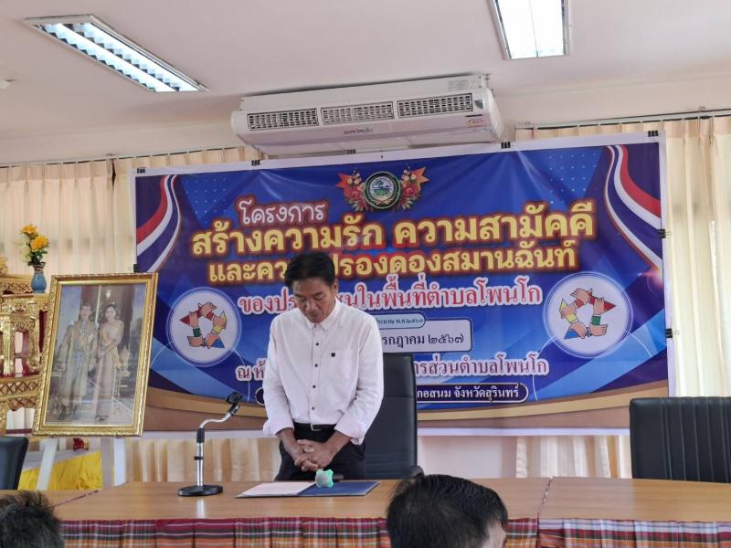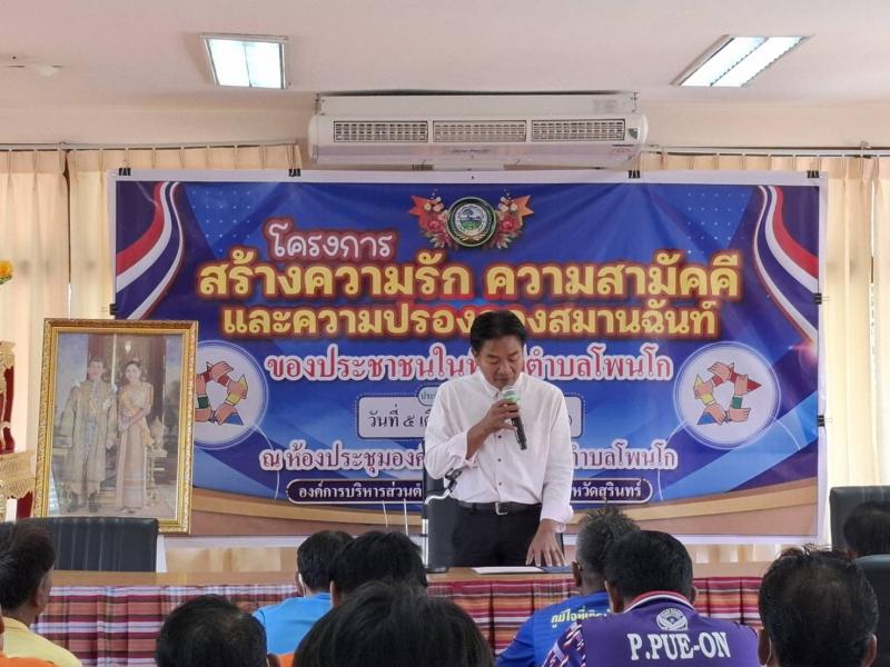 วันศุกร์ ที่ 5 เดือน กรกฎาคม พ.ศ. 2567 องค์การบริหารส่วนตำบลโพนโก จัดอบรมโครงการสร้างความปรองดองสมานฉันท์ ประจำปี 2567 มีว่าที่ร้อยโท สกุล แสนมั่น นายอำเภอสนม เป็นประธานในพิธีเปิดโครงการฯ โดยมี นายสุรินทร์ ตรองจิตต์ นายกองค์การบริหารส่วนตำบลโพนโก เป็นผู้กล่าวรายงาน การฝึกอบรมในครั้งนี้ กำหนดจัดขึ้นเพื่อให้บุคลากรขององค์การบริหารส่วนตำบลโพนโก ผู้นำชุมชน และสมาชิกองค์การบริหารส่วนตำบลโพนโกได้มีความรู้ความเข้าใจหลักการปกครองระบอบประชาธิปไตยมาใช้ในการดำเนินชีวิตได้อย่างเป็นรูปธรรม โดยมีวิทยากรจากกองอำนวยการรักษาความมั่นคงภายในจังหวัดสุรินทร์บรรยายและดำเนินกิจกรรมในการฝึกอบรมในครั้งนี้ ณ ห้องประชุมองค์การบริหารส่วนตำบลโพนโก
