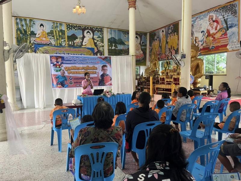 นายสงวน พิสิษฐ์รัมย์ รองนายกองค์การบริหารส่วนตำบลโพนโก เป็นประธานกล่าวเปิดงาน โครงการส่งเสริมพัฒนาการรอบด้านและการเรียนรู้ทักษะทางด้านสมอง ( EF ) ณ ศาลาการเปรียญวัดแจ้งบ้านหนองบัวแดง